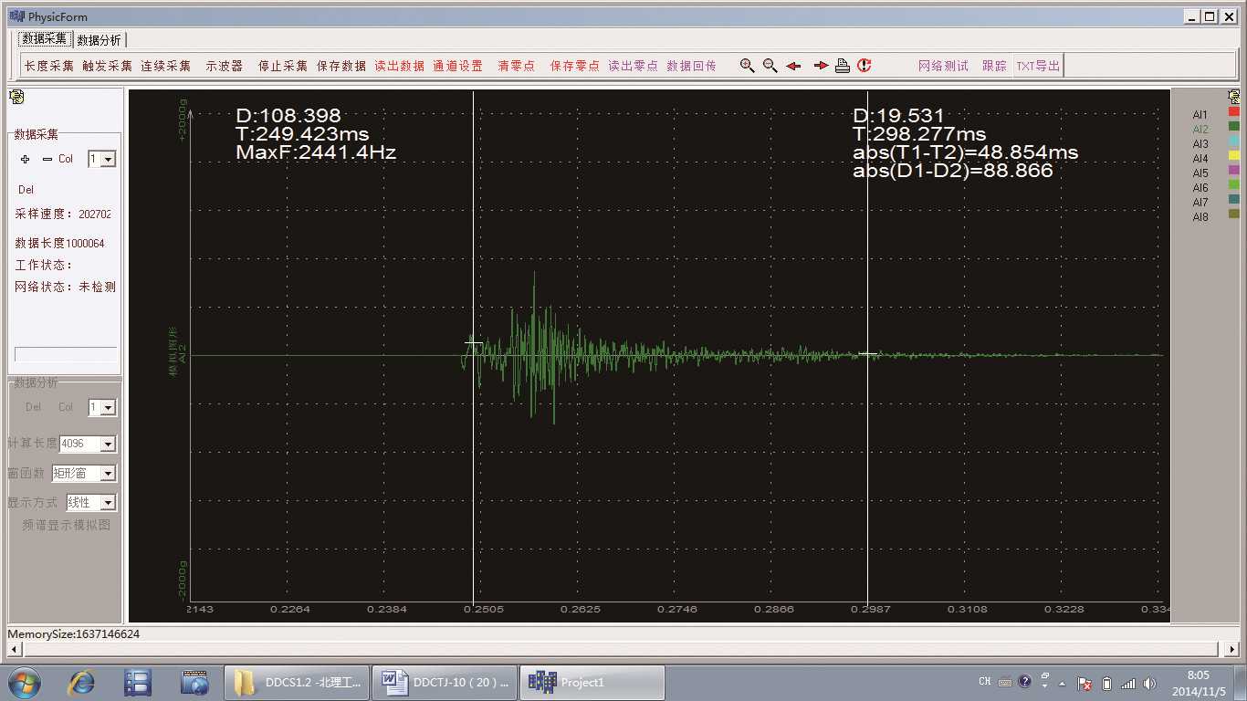 2、觸發(fā)采集:CH1通道信號啟動觸發(fā),觸發(fā)電壓可以設置。